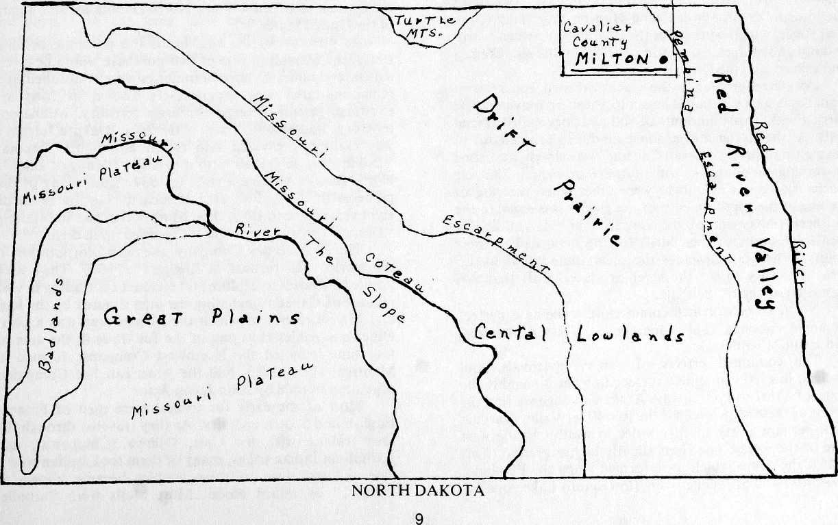 It is on this plateau or drift plain where Milton is located, about four miles west of the Pembina escarpment. This drift plain, very wide at the Canadian boundary and narrowing to the southeast, is the second of the three "steps" of our state and meets to the west with the Missouri plateau, or third step.
