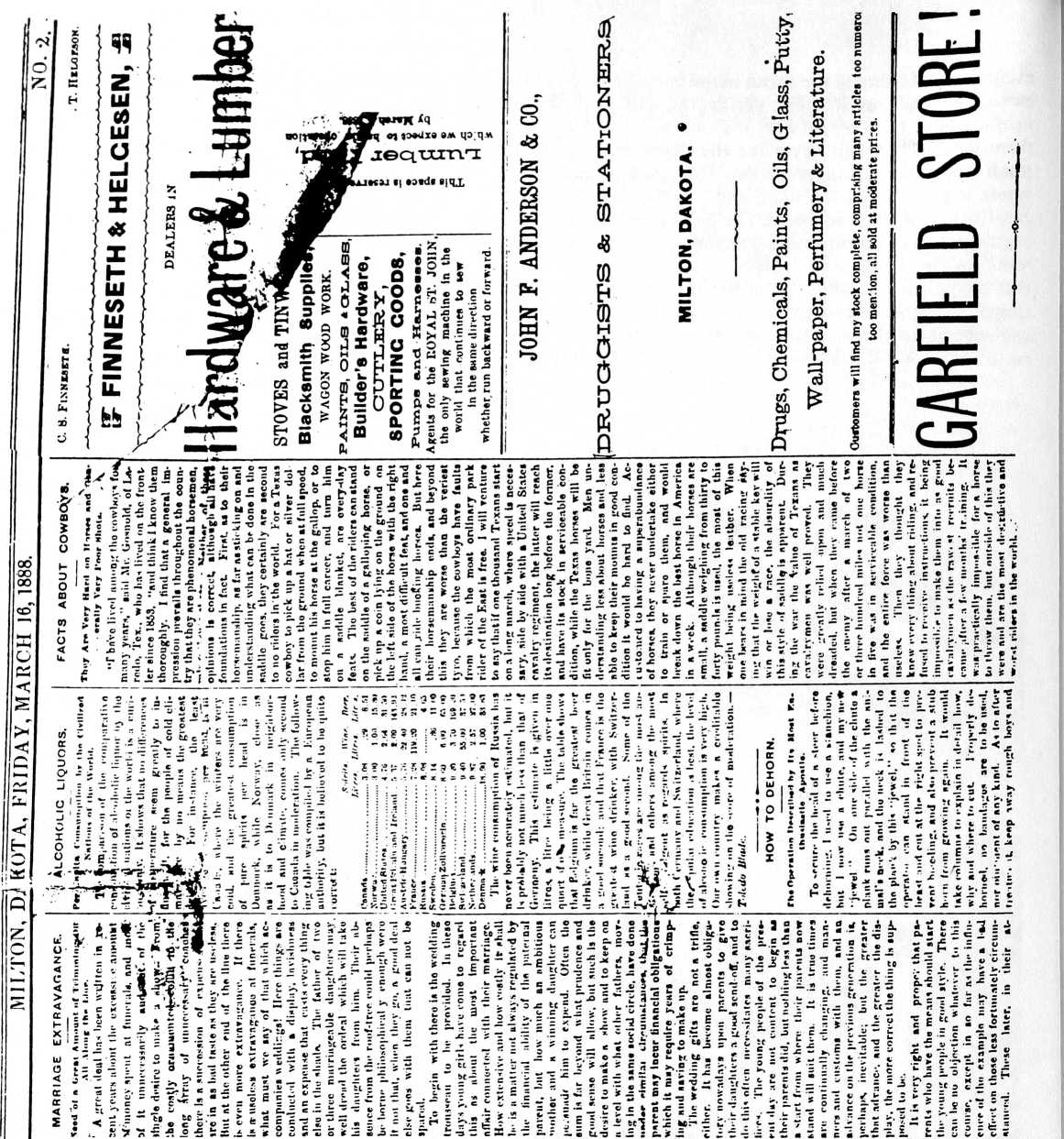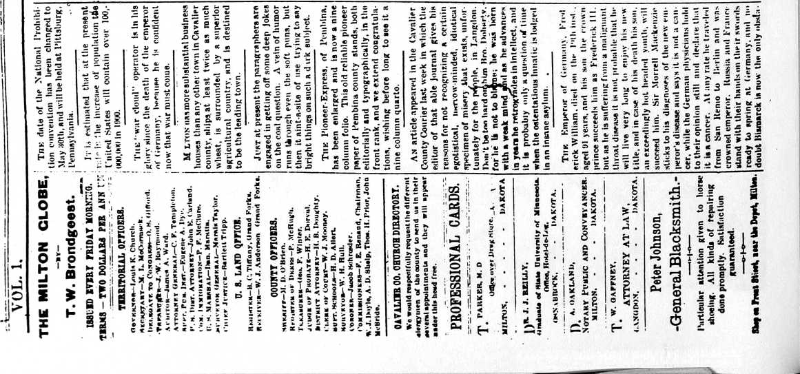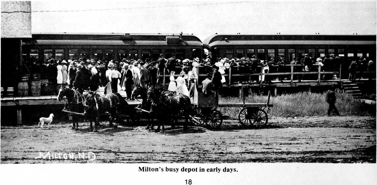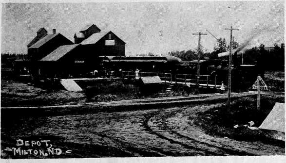 It was Mr. McKenzie, Steve Sophar and Don McDonald that named Milton. Mr. Sophar had come from Milton, Ontario. Mr. McDonald wanted to call the then expected new post office Springfield. However, they finally decided to call it Milton. They then sent to Washington and soon received word back that the name of Milton would be all right, as there was no other name of Milton in North Dakota and they could have a post office with mail three times a week from Grafton. Don McDonald kept the post office while his brother kept a store in the same building. He had to freight the goods from St. Thomas and Grafton. In the fall of 1887, the new Milton was started when the railroad went through.