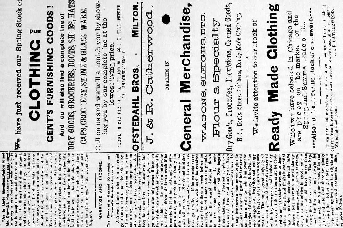 After the establishment of Milton, and before any churches were erected, church services were held in stores and vacant rooms, for the community was for the most part deeply religious. Well do I remember the first Sunday service held in an unfinished hardware store. Seats were made of rough boards placed crosswise upon stoves and other supports. Being a fine day there was a large crowd in town, far too great to be accomodated, but additional seats were improvised and one well known young man carrying a board on his shoulders, in his excitment, swung it around rather carelessly and gave one of the elders a thumping whack on the side of his head. It brought from the victim who was very hot tempered, an expression which did not sound like "bless it.’’ After the service an ample apology was tendered and accepted, and the couple were afterwards firm friends.