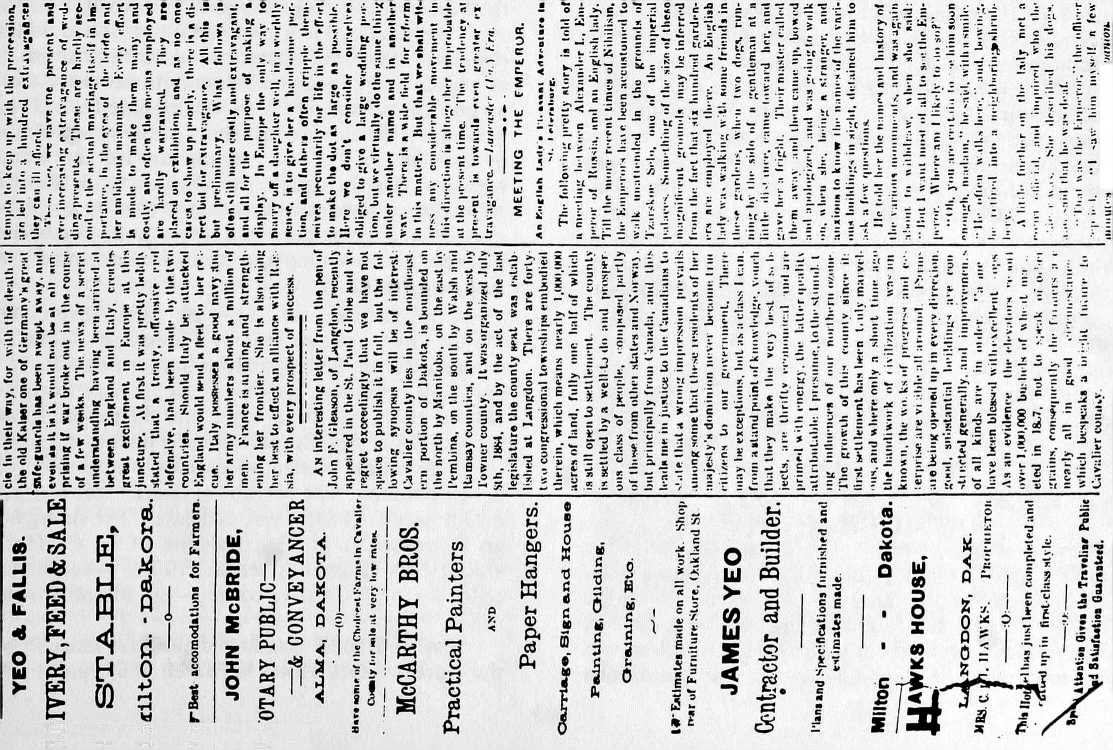 Langdon, the county seat, was, as you know, called into existence by two well known clever politicians. My first visit was to pay my taxes, in company with others of my neighbors. I think it was in the year 1884. The city consisted of a frame building used as a courthouse, one store, one private house with the inevitable pioneer of civilization, viz, a saloon. The owner of the store kindly sheltered me for the night. The railway soon headed for the county seat and changed the aspect of things.