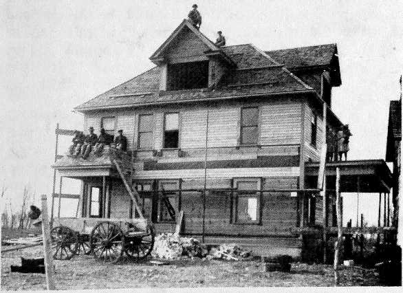 Upon making inquiries we found that the Great Northern Railway Co., without so much as consulting the citizens of Garfield, had located their line several miles east of the Golden Valley and laid out the site of the present city of Park River. After mature consideration the discomforted citizens of Garfield came to the wise conclusion that as the mountain would not come to them, they had better go to the mountain, and so carted their stores and residences just as they were, on wagons, wheels and roller, across the prairie to the new town where many of them succeeded in becoming wealthy and enterprising citizens.