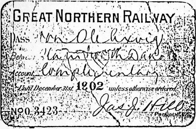 About 1890, it was customary for the railroad to issue passes to prominent people and we quote the following story about Ole, who was on his way to the legislature at Bismarck in 1891 and not having a pass, he decided to try to get one. When he reached Larimore, he sent a wire to James J. Hill and simply stated, "I am here," and signed it, "Ole," An hour and a half later, a telegram came back from St. Paul saying, "I am here, too." and it was signed by James J. Hill.